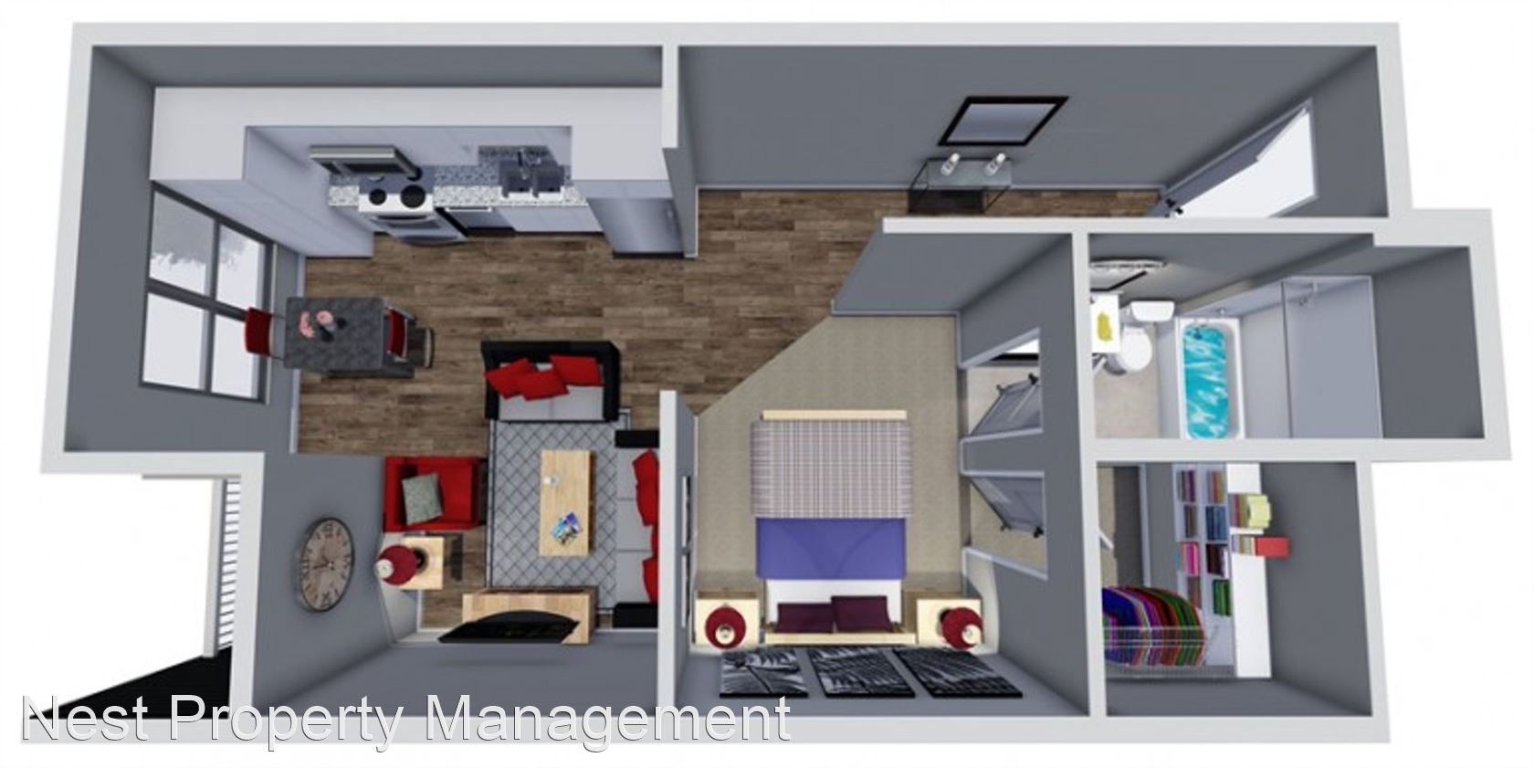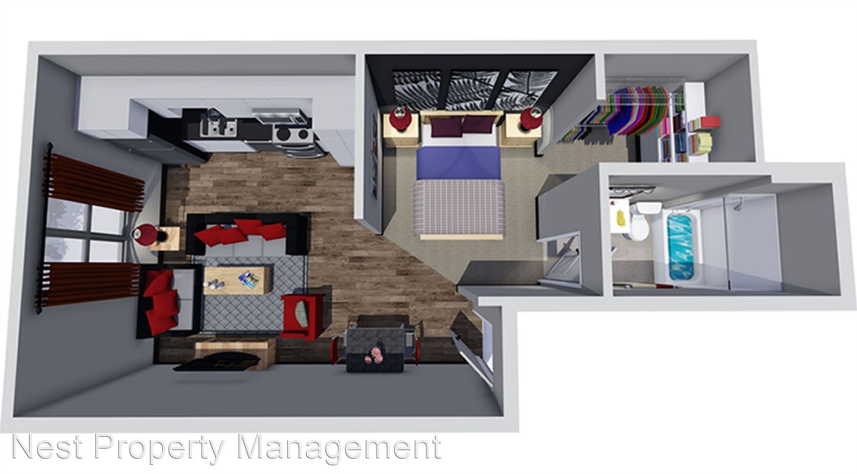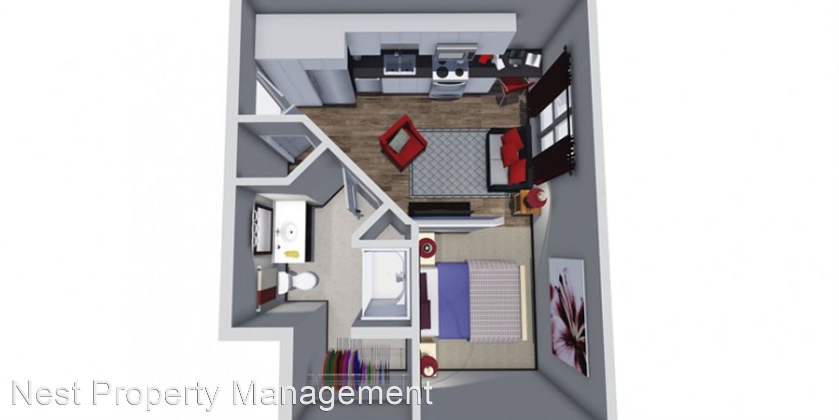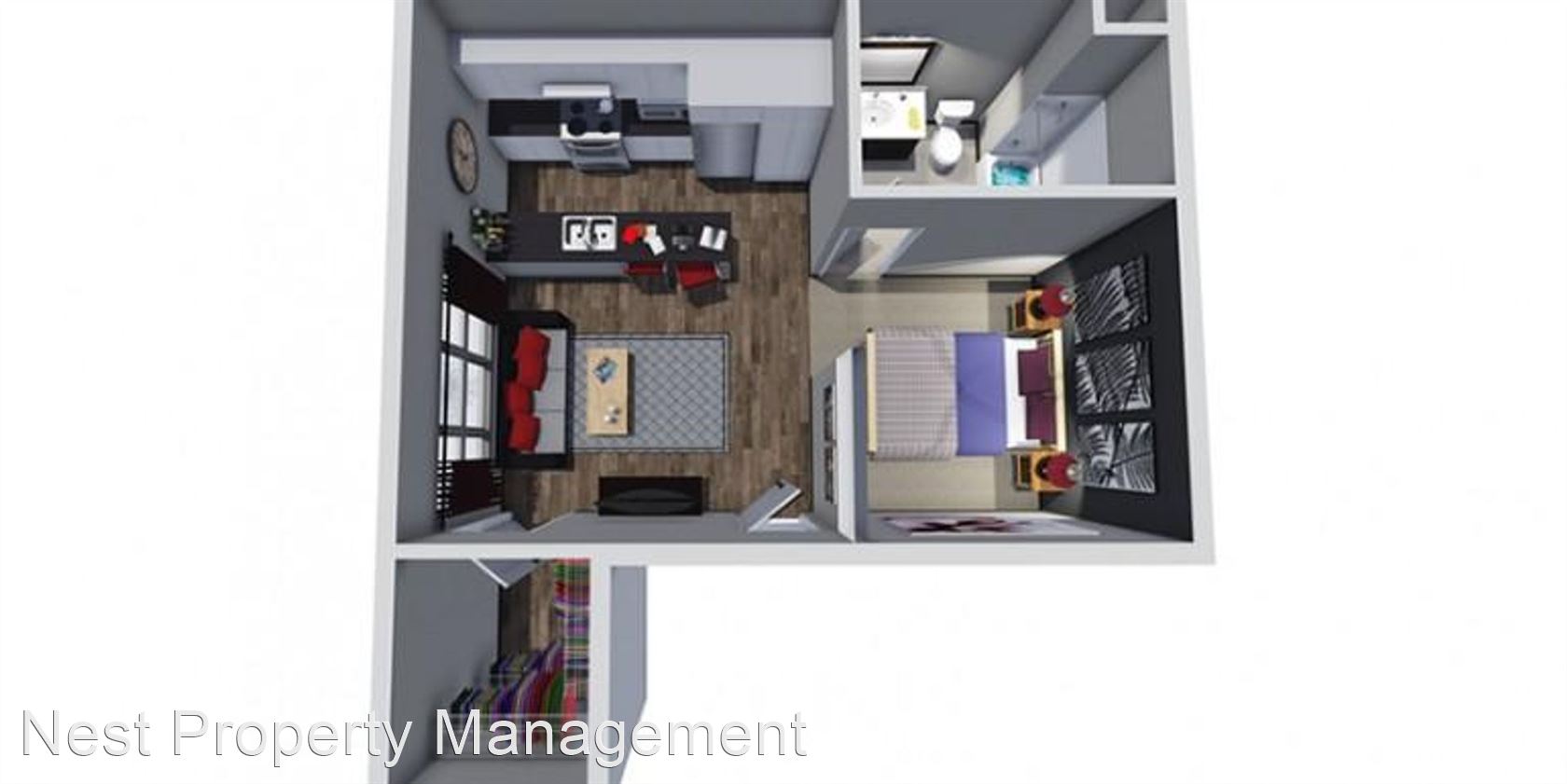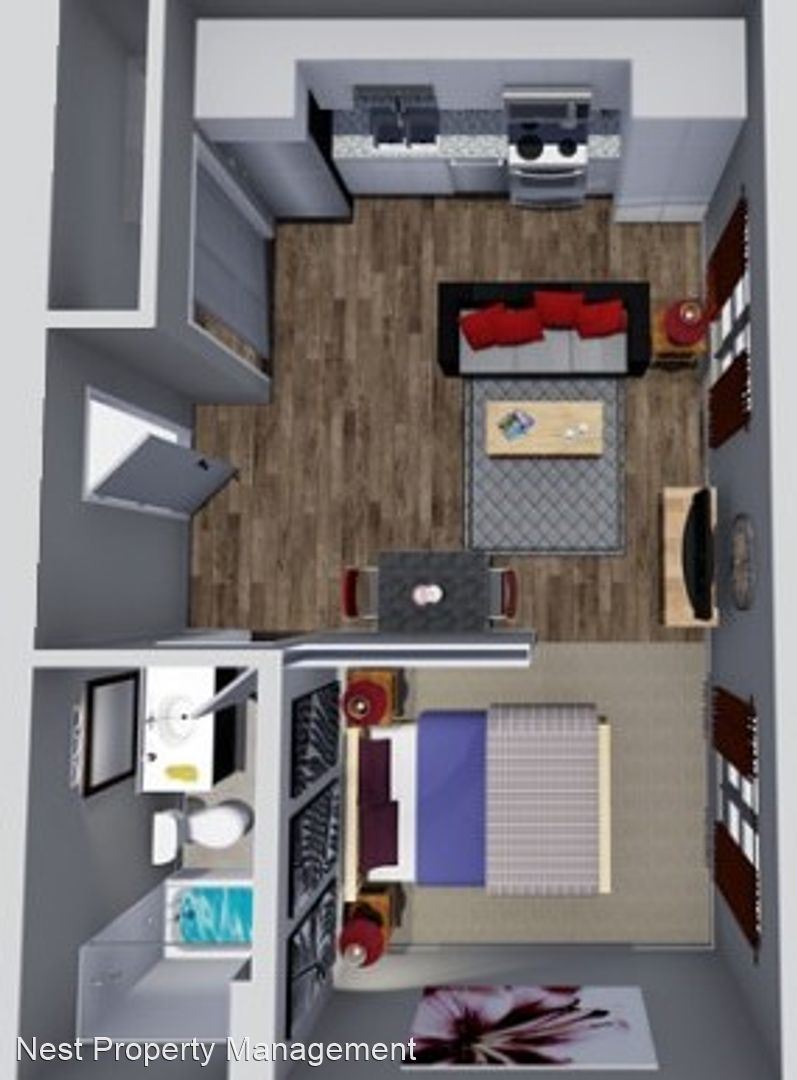 5 Lincoln Ave - Floor Plan E - These one bedroom and studio units on the first and second level at 5 Lincoln Avenue were built brand new in 2015. These luxurious units provide a clean, upscale, healthy, and secure environment and are catered to graduate/PhD level students and/or professionals. The apartment complex is in a great location less than 1 minute from The University of Iowa Dental and Medical Schools, and the complex is an easy walk to Kinnick Stadium, Carver-Hawkeye Arena, The University of Iowa Hospital, and the University of Iowa Law School. These brand new units include wood flooring in the kitchen, living room, and hallway, and there’s carpeting in the bedroom and bedroom closet. The apartment also boasts central heating and air conditioning and 9 foot ceilings. The kitchen includes granite counter tops, dishwasher, garbage disposal, electric oven, microwave, and refrigerator. The living room is spacious with plenty of room for couches, chairs, and an entertainment center. The bathroom includes vinyl flooring, sink vanity, and tub/shower combo. The apartment complex includes an on-site laundry room and lounge. There is a community 2,200 sq. ft. rooftop patio/deck with propane gas grill. There’s also optional heated underground parking available. The unit is located directly next to a bus stop and is directly across the street from the University of Iowa Dental School area. Heated underground parking (optional) Non-smoking and no pets (unless required for disability)