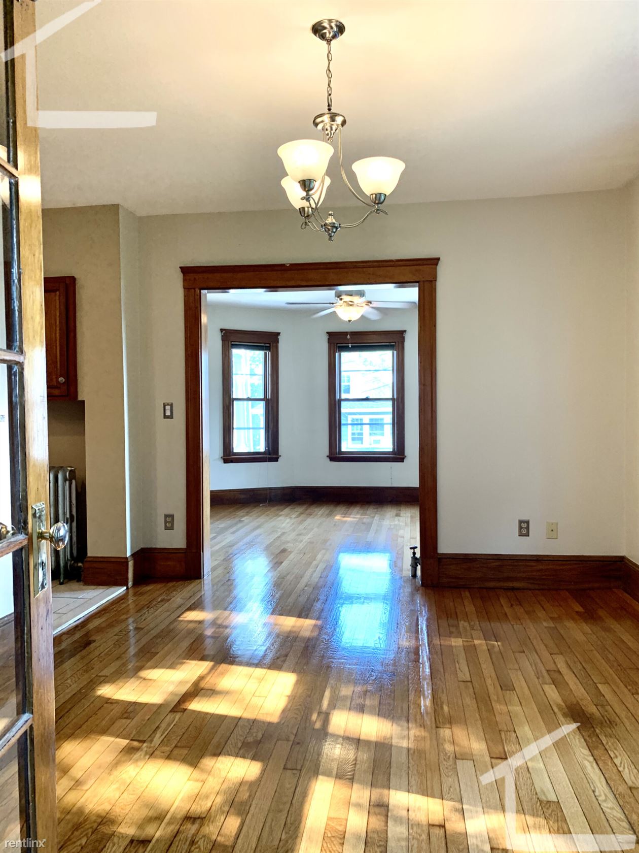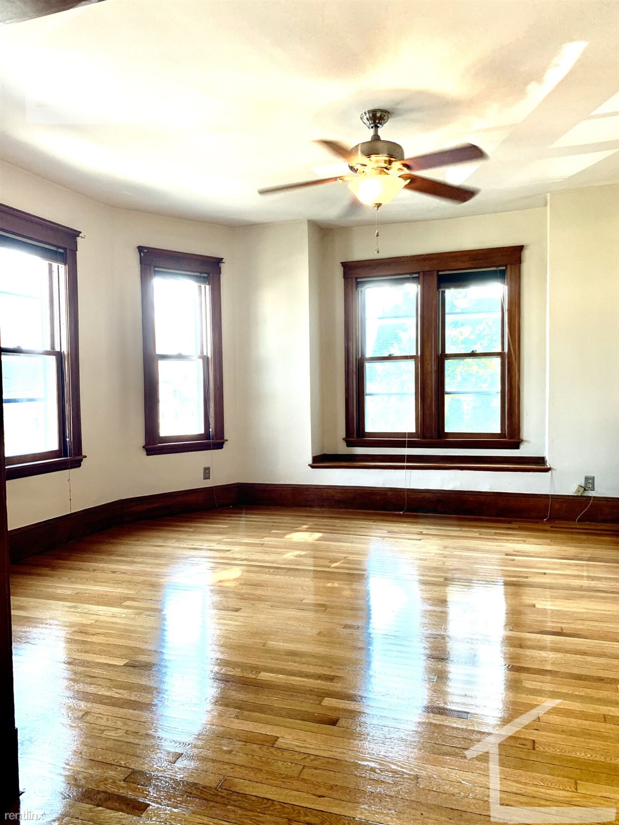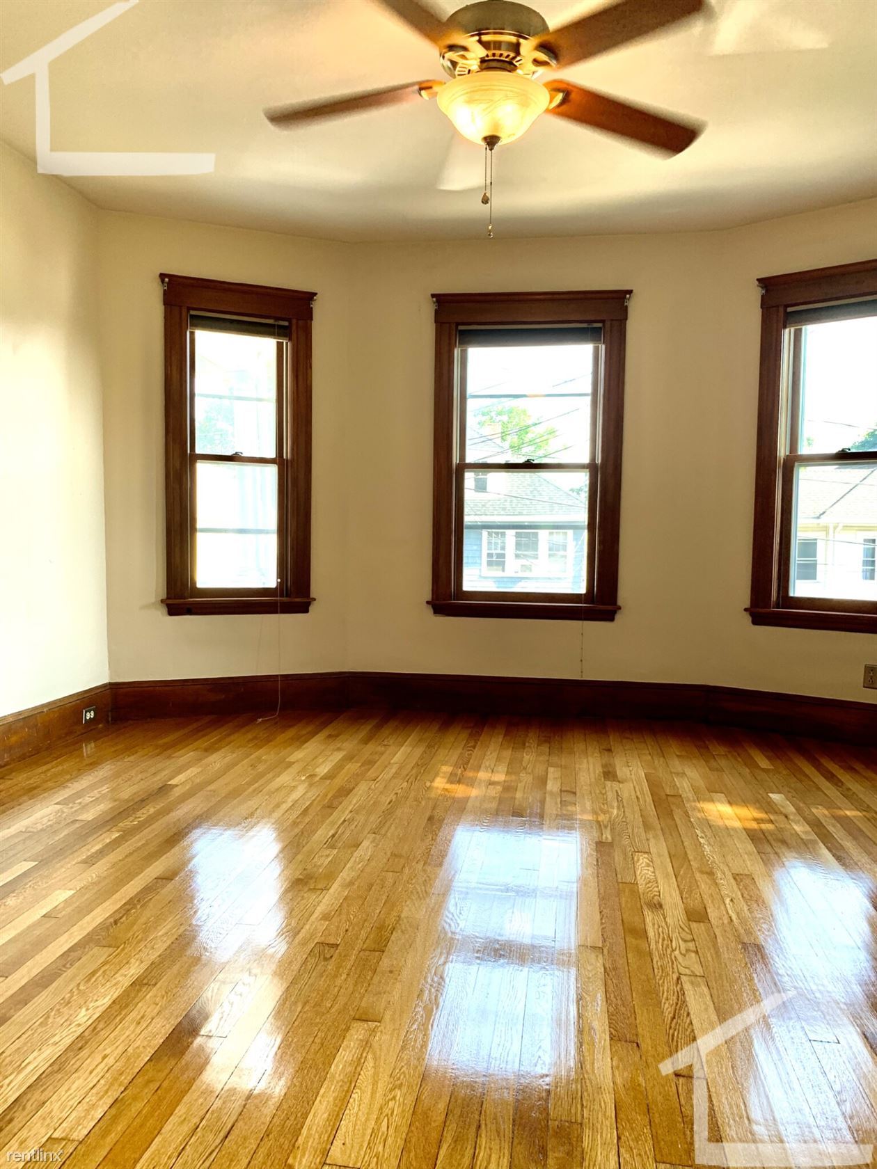 Custom blinds and refinished hardwood floors throughout
